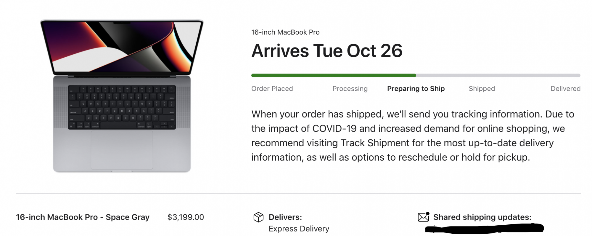 Thank you for your calming words. I’m beyond excited for the 14” so I’m nervous as hell, however, I learned one thing from my order: Apple prepares shipping very, very well and thoroughlyFingers are crossed we see some movement or anything at this point today or tomorrow. Even if it is set for a overnight delivery. We should still expect to see a scan.