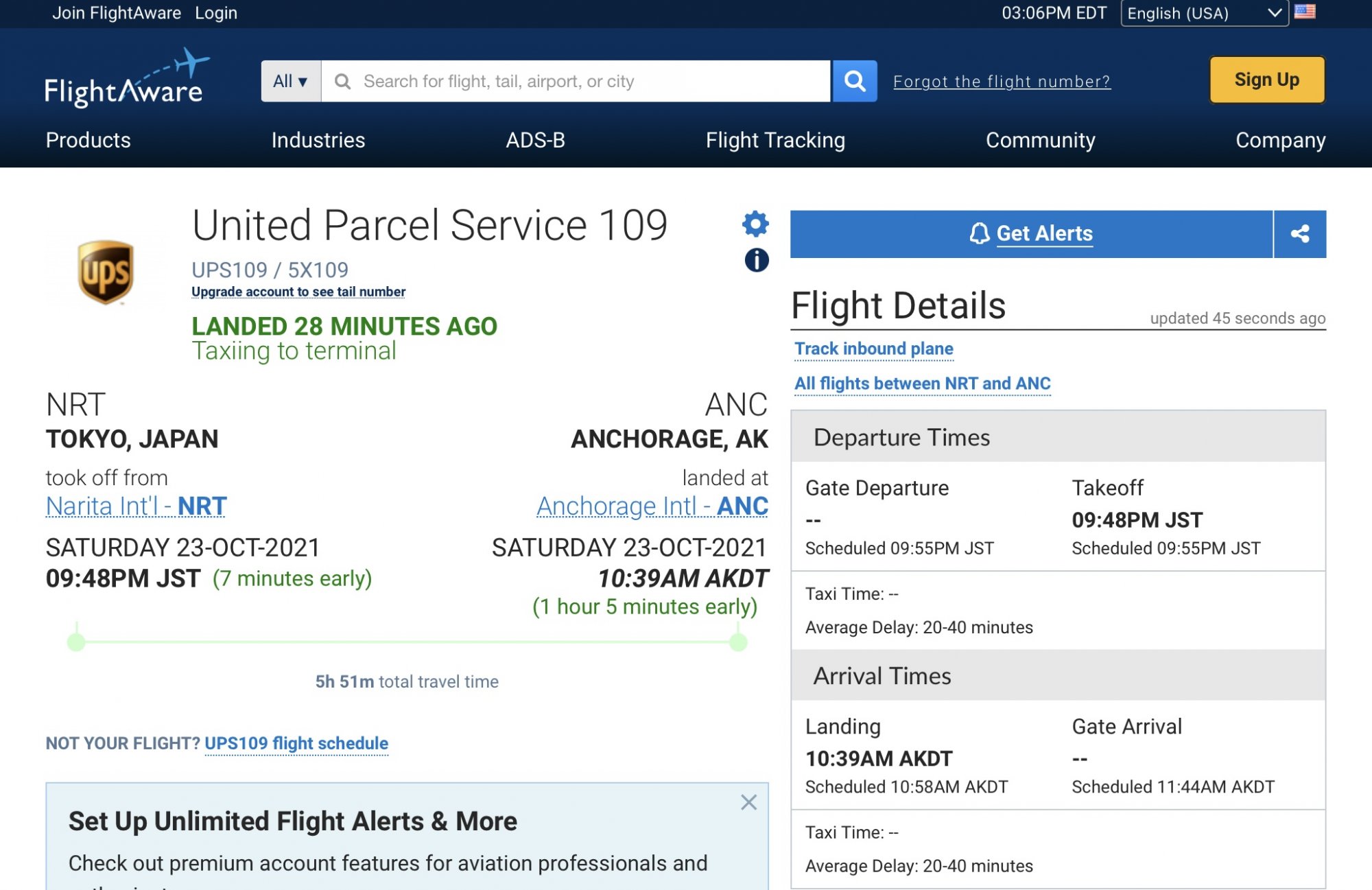 5X109 (UPS109) United Parcel Service Flight Tracking and History 23-Oct-2021 (NRT / RJAA-PANC) - FlightAware