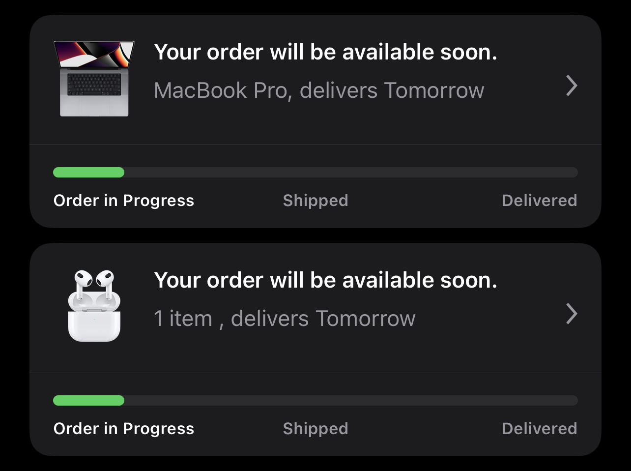 Just refreshed my choice. There’s a tracking number for an 8.75 lb pound package from Apple for delivery tomorrow from PA.Got the UPS tracking number a few minutes ago. UPS tracking states 'label created check back tomorrow,' but Apple email indicates on schedule for 'express delivery' tomorrow (Oct. 26).