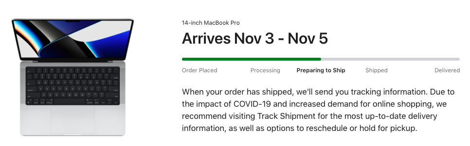 Still no tracking info. Apple Card charge still pending (since Thursday), though I have received the credit for the 6% bug. Base model 16" Max ordered just a few minutes after the store opened. I'm just a few blocks away from one of Apple's distribution centers - maybe they plan to hand deliver it?