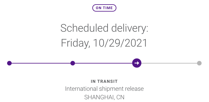 Shipped from Shanghai via FedEx estimated Delivery date October 29th (South Florida).