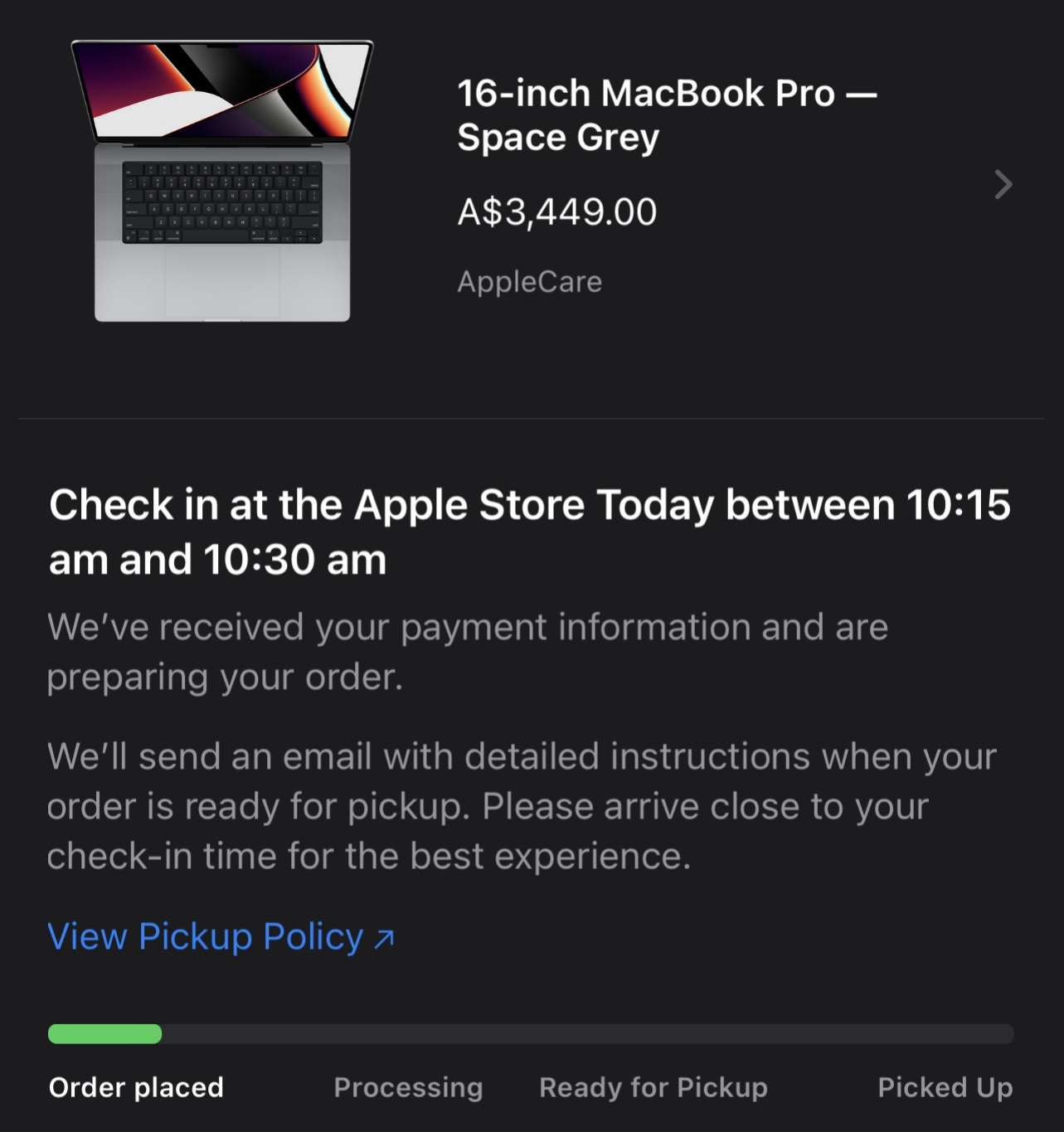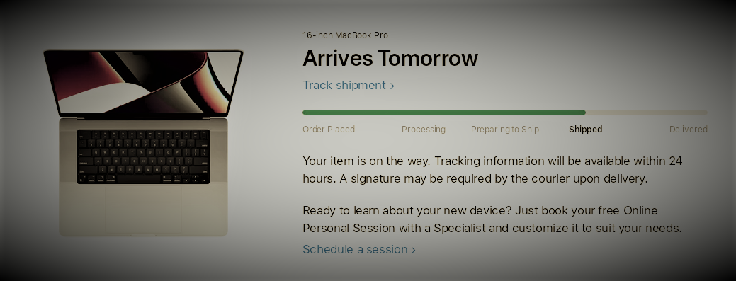 Update: UPS "Origin Scan" has been hit. Let's go!!!Confirmation from Apple: MacBook Pro SHIPPED!!!At last! Apple finally shipped my MacBook Pro 16". I was provided a tracking number via UPS however it is not updated as of yet in the UPS's system. Most likely it will be updated later today. I'm very thrilled to announce it is coming home tomorrow!