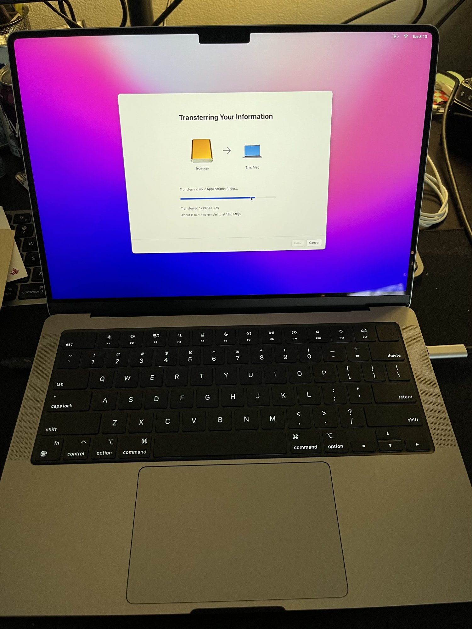 There is always the option to do a migration using a Thunderbolt 3 cable...much faster...Just got my 14-inch (10 core) in Toronto (east side), and am glad I spent the money to buy an external thunderbolt SSD. It’s only been 10 minutes to transfer over 300gb of data from my old machine.