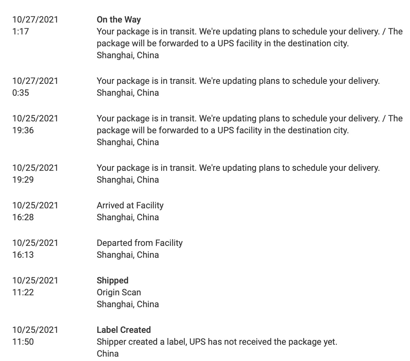 You're not alone. There's quite a few of us that are stuck. My tracking status is virtually identical to yours. Here's mine. Whatever is going on in Shanghai right now, must be an absolute mess.As a long time Apple customer (and developer), this day pretty much sucks for me.