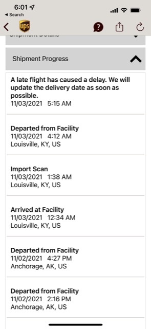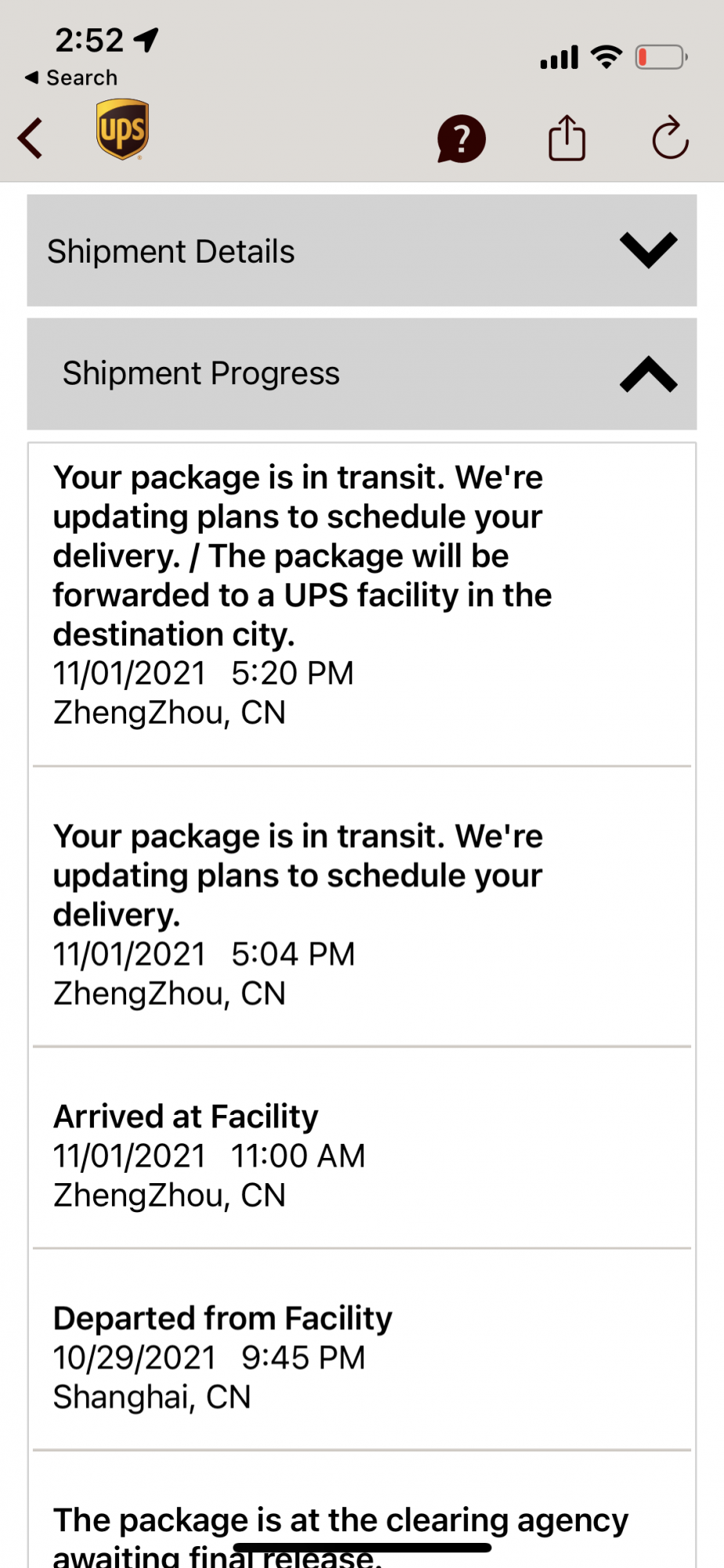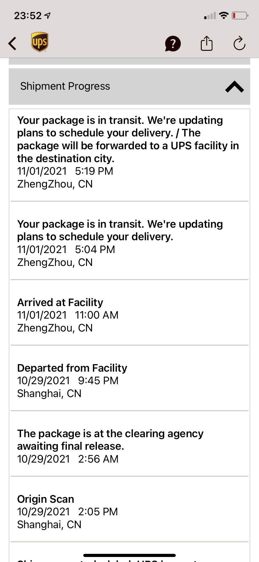 what’s the service level for ups in shipment details?Mine says next Tuesday, but has been in ZhengZhou since 10/29. I got you beat.