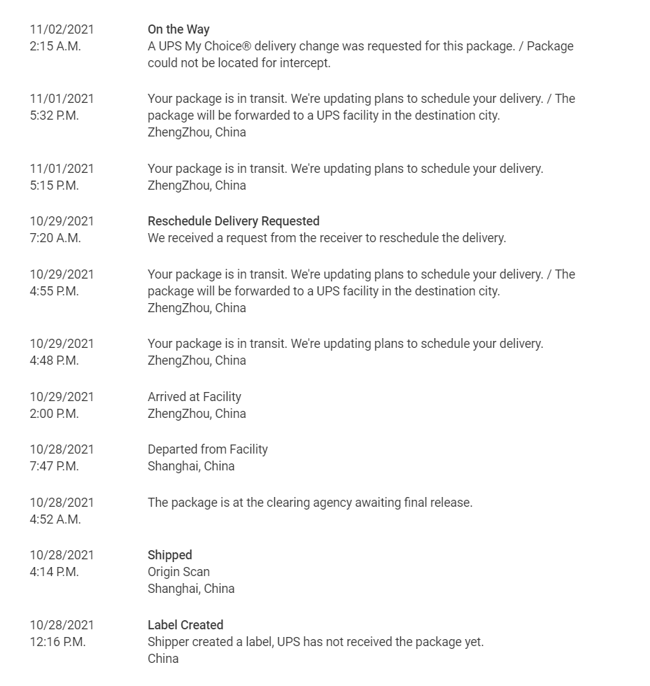 There's been no UPS flights to my city's hub from Kentucky. The earliest UPS flight from Kentucky is about to leave in 1hr 30mins. If my order is on that plane, it'll land by 4:43pm and the truck driver would only have from 5-8pm to make the delivery? That seems so rushed. There are 4 other UPS flights with various departure times to my city hub, but that would more than likely result in a Nov 4th Delivery.