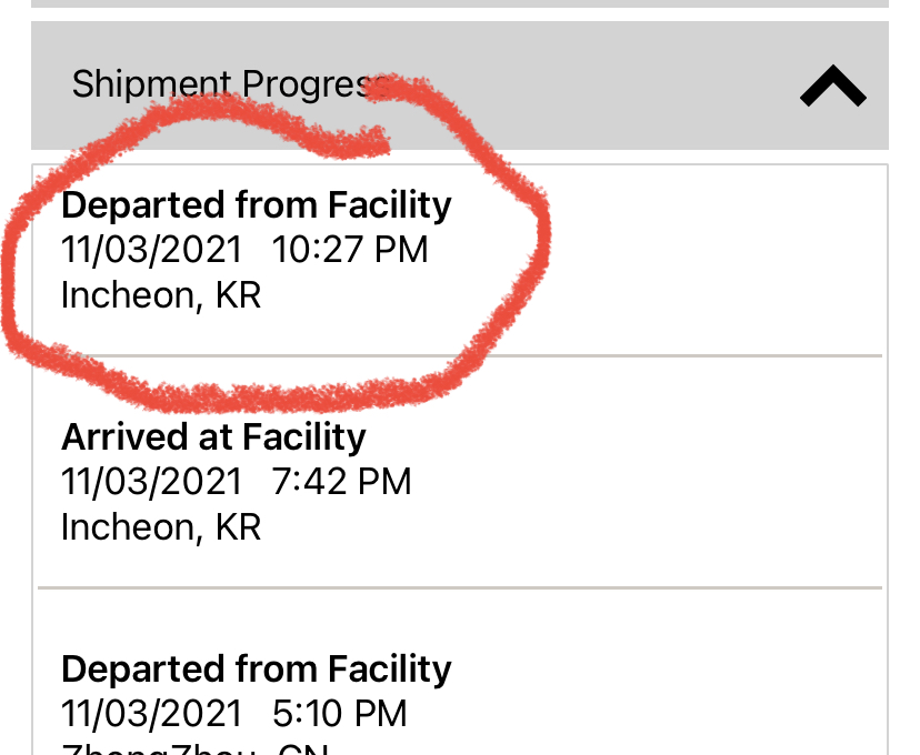 UPS also shows two departures from Incheon, Korea for me: 8:25am and 10:13am. Not sure what 10:13am is about, that wasn't there last night and only appeared after Alaska arrival update: