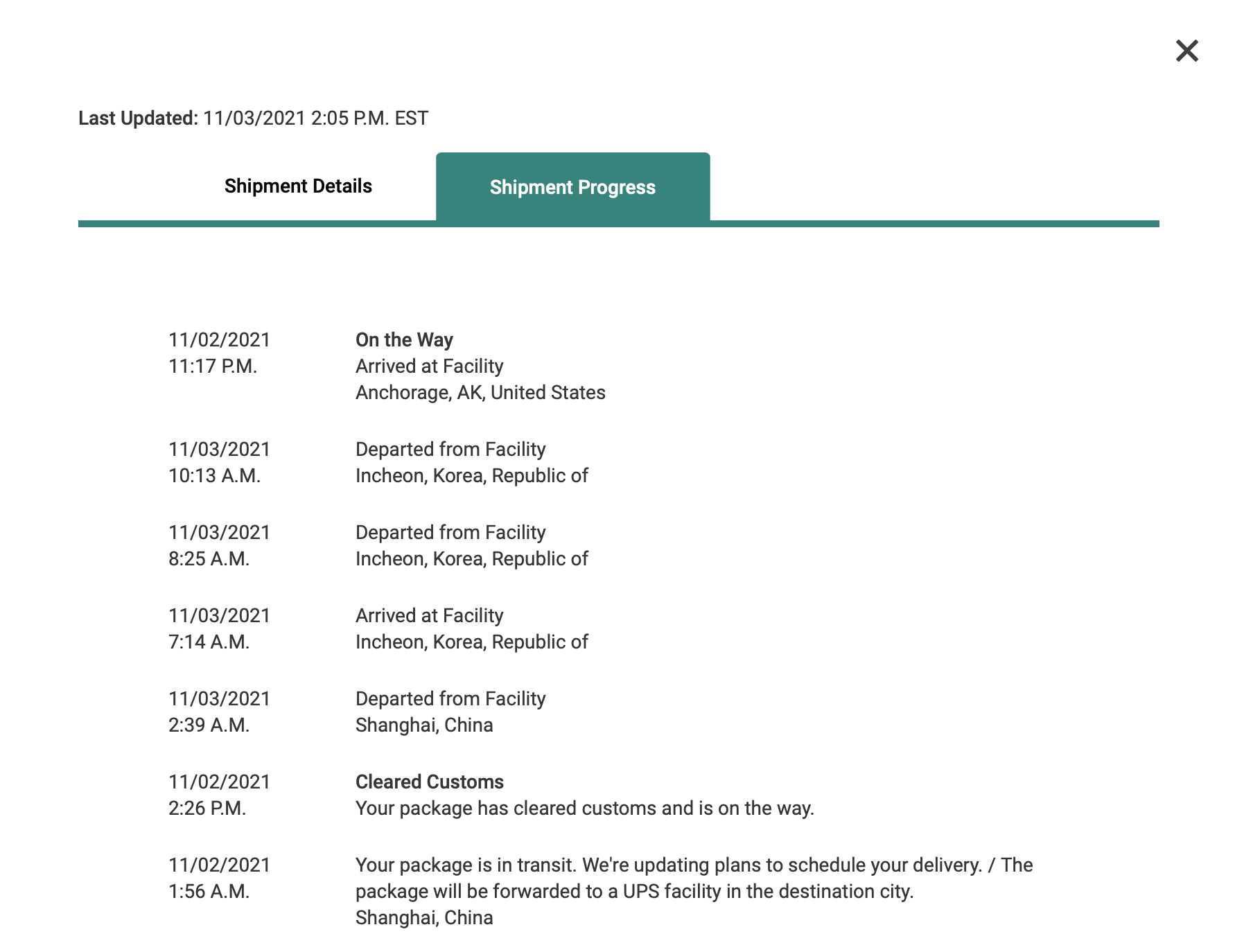 UPS also shows two departures from Incheon, Korea for me: 8:25am and 10:13am. Not sure what 10:13am is about, that wasn't there last night and only appeared after Alaska arrival update: