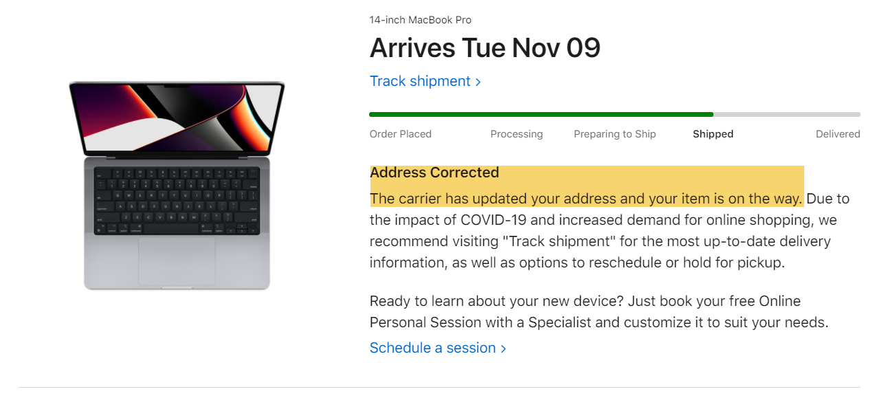 I'm sorry that you got pushed back. Apple seriously overcommitted themselves with this launch. ☹️ This whole process has been screwy.This 16" Max purchase was more stressful than buying an xbox series x haha. Ordered within 10 minutes of the keynote, battled overloaded servers, etc. Just noticed today that apple pushed my delivery window back a week, was originally Nov 3-10. Now 10-17. However, it's moved from processing to "preparing to ship" though.