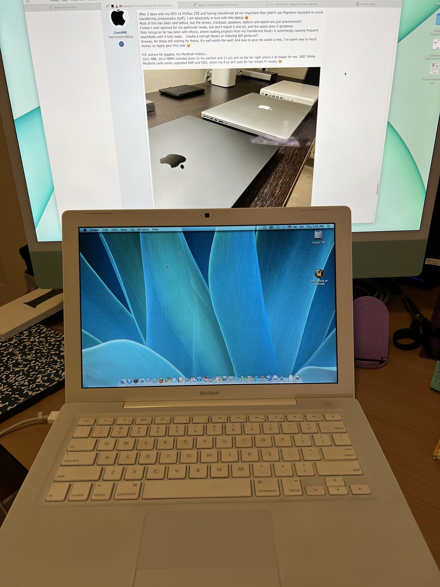 2021 MBP, 2012 MBPR (handed down to my partner and 11 yo) and on the far right where it all began for me: 2007 White MacBook (with easily upgraded RAM and SSD, which my 8 yo still uses for her simple IT needs) 🤓