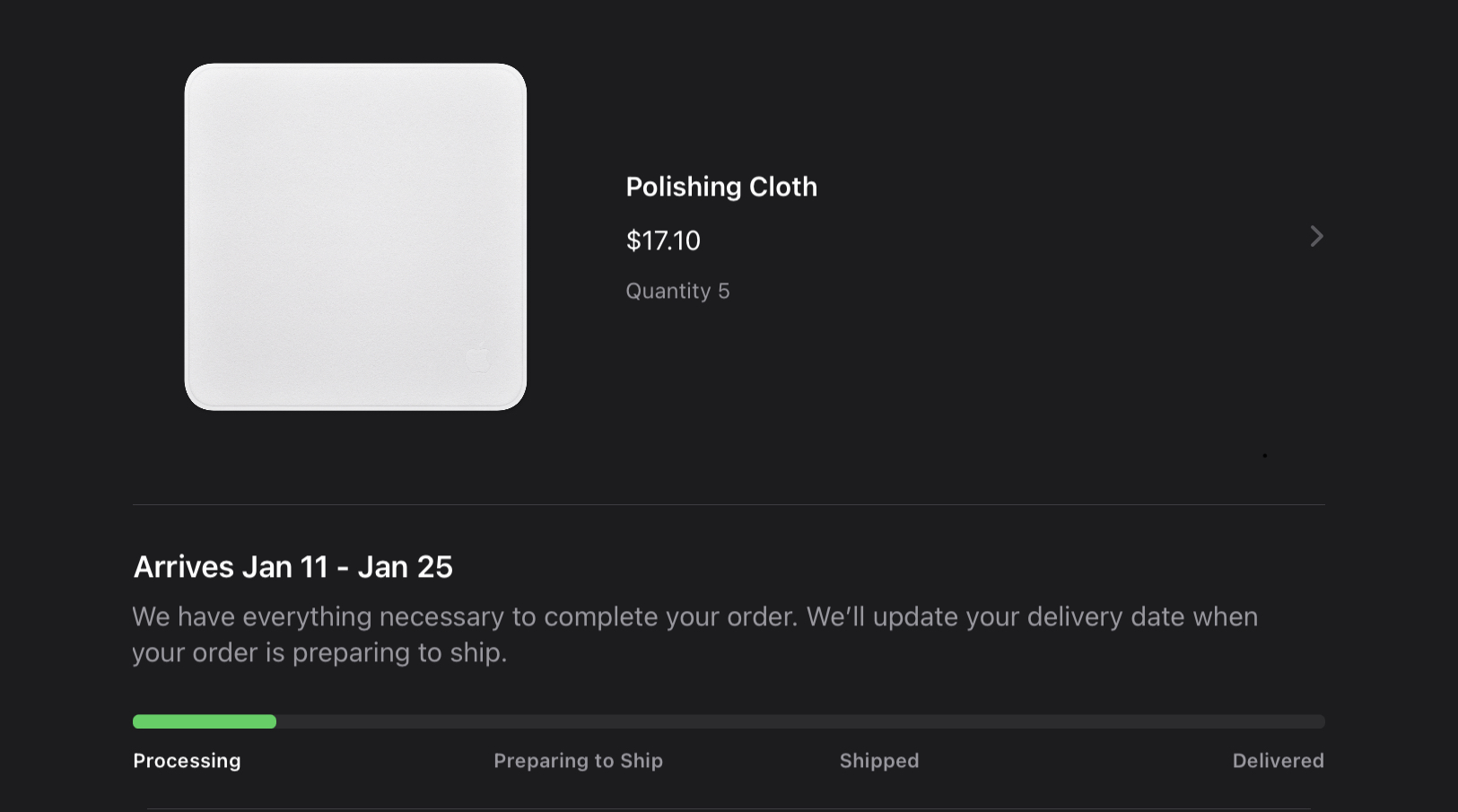 Ahhh, such an expensive year for you too. Haha, why not 😂 it doesn’t hurt to add 5 cloths into the cartWait! What? My purchases this year: 11” iPad Pro 2020, Apple TV 4K, iPhone 13PM, Apple Watch (and bands galore), MacBook Pro 14”. After all that avalanche of $$$$, I need to buy 5 (FIVE) cloths too????
