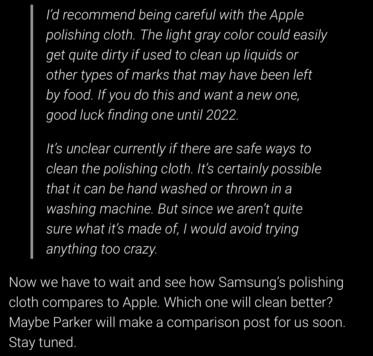 The heading… “Apple’s new Polishing Cloth has taken the world by storm” - Facts! Lol can’t believe Samsung is following Apple over this. Copying Apple over a cloth, come on!