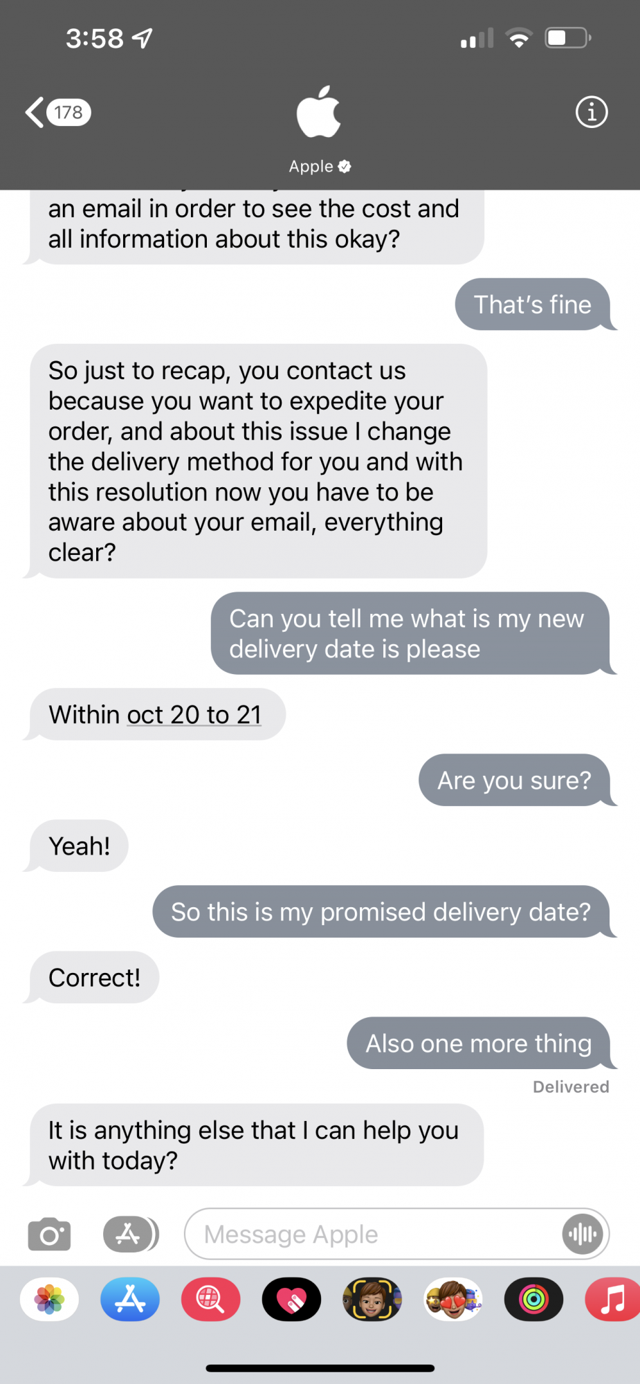 No idea what Apple is smoking today but I texted Apple and told them if they can expedite my order for the new MacBook Pro M1 Max. This representative told me my delivery has been expedited 😂 I should receive my order on Oct 20th or OCT 21 😂 💀