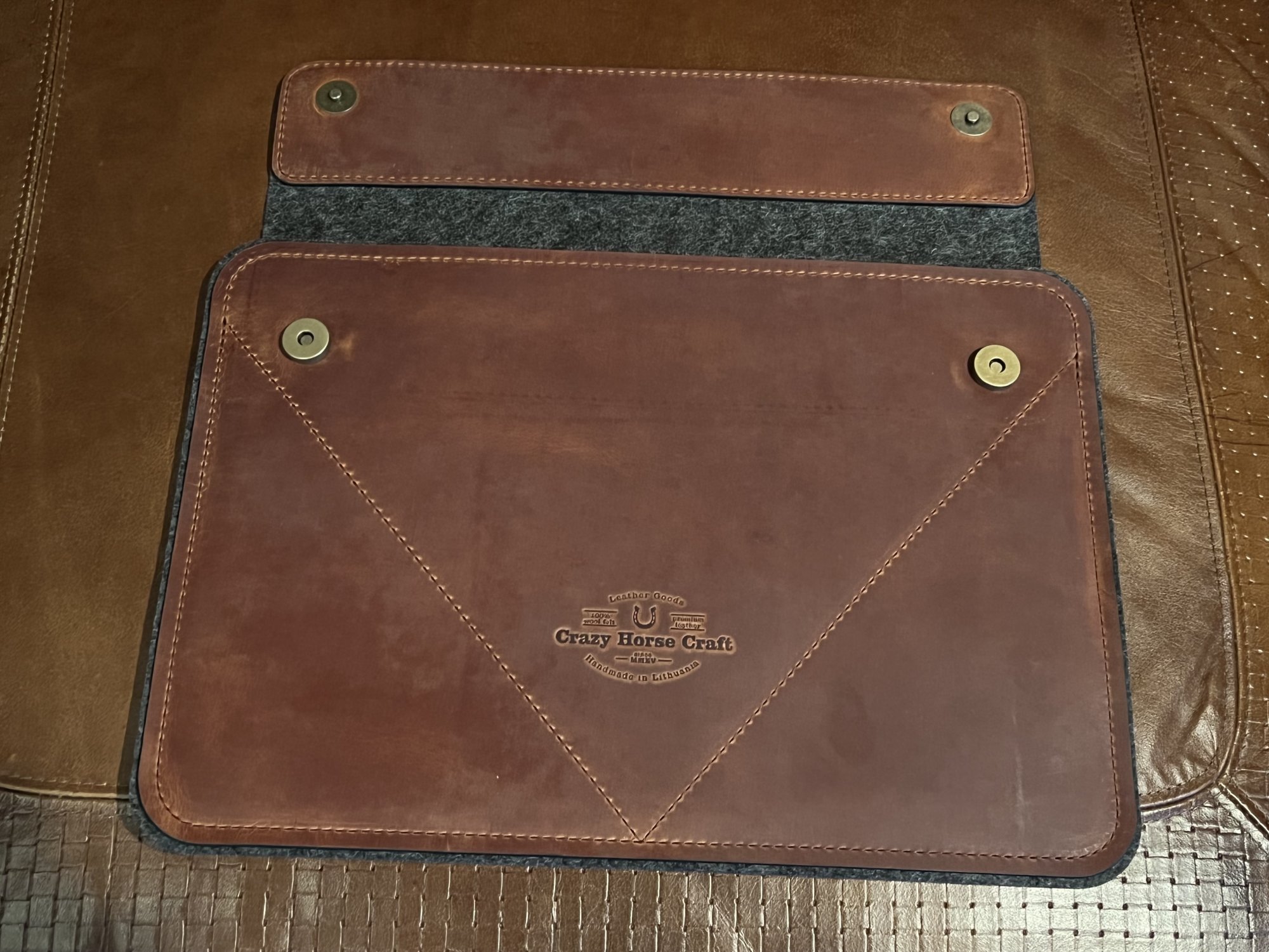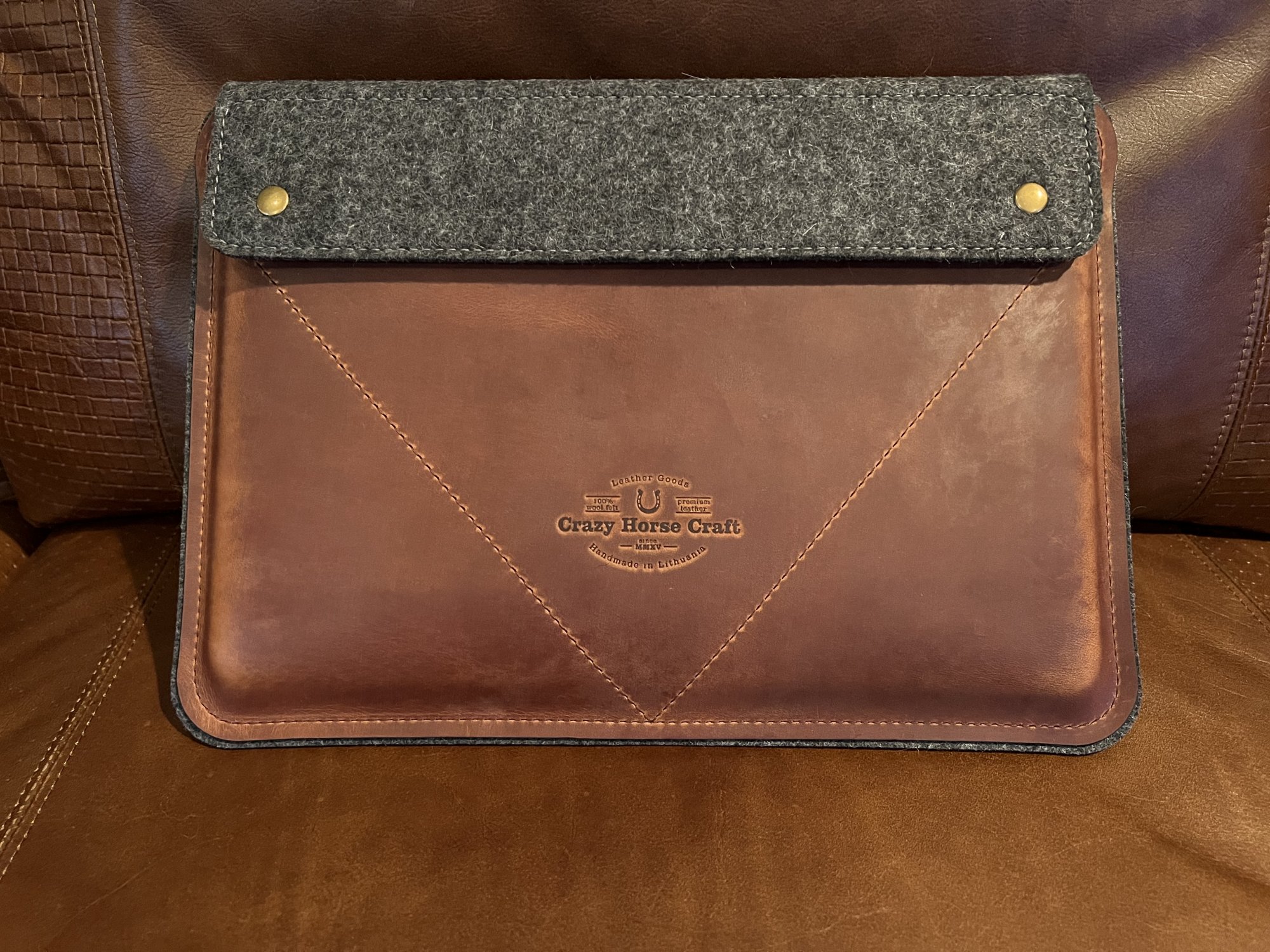 Received my leather sleeve today. Very thick full-grain oiled leather, Merino wool felt lining, magnetic clasps, handmade to order. Nice fit. Extremely well made. Didn't take a picture of the back, but it's leather also.