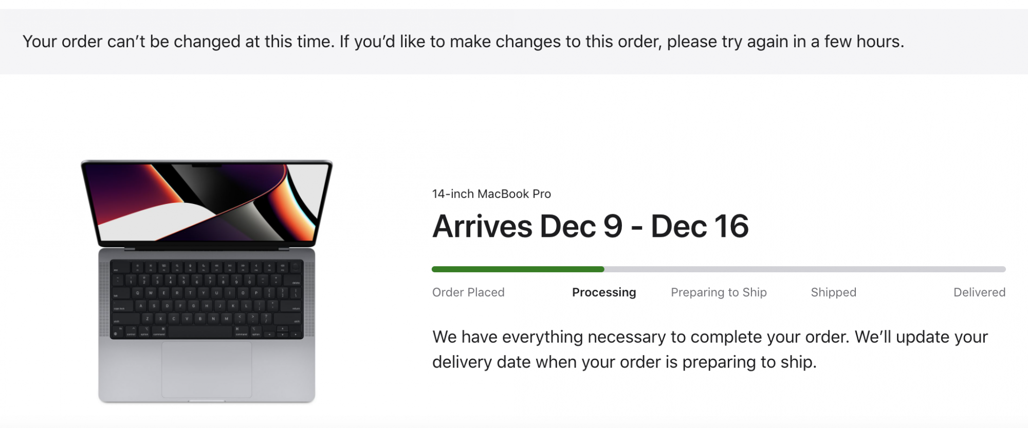not for me when i look online on my 13 inch MacBook Pro- but the app has the cancel buttonI just saw the same message, my arrival date is 29/11 – 06/12. I think it was just an outage on the app/website, rather than an indication of any movement. The "cancel this item" option is back again for me.