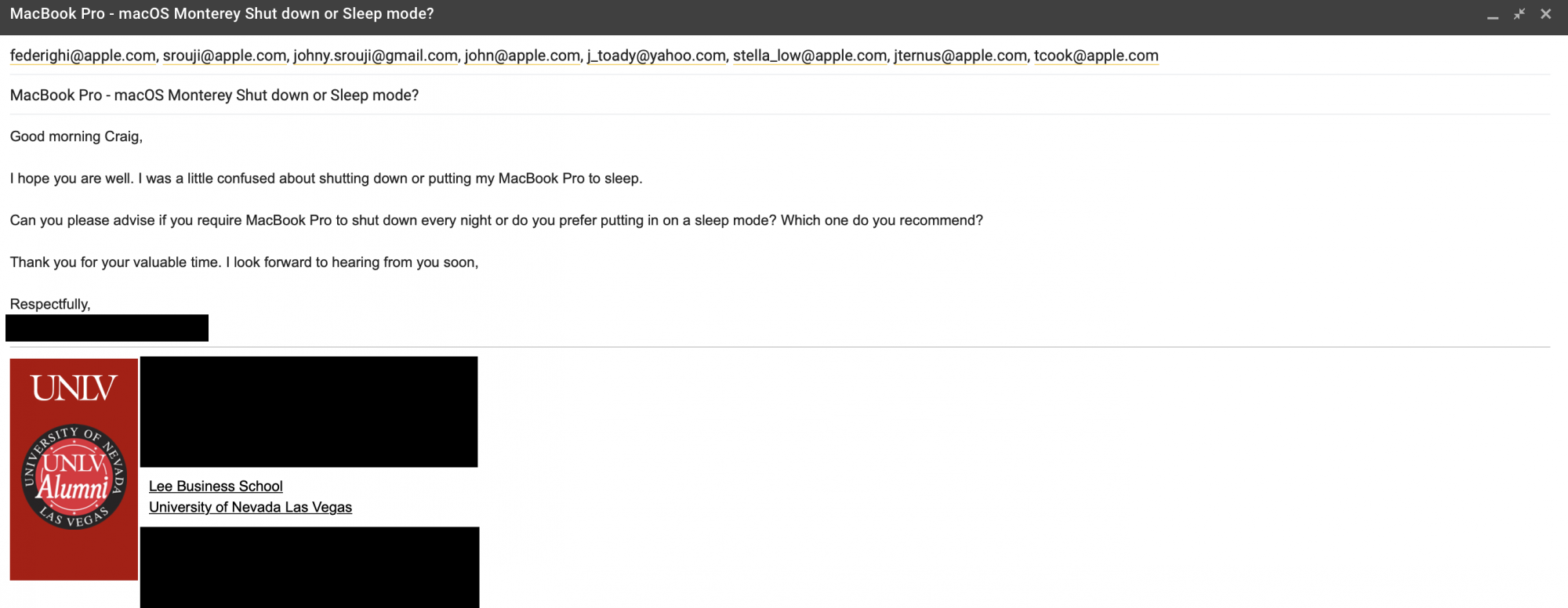 I thought you were going to address several issues? Memory leaks, MagSafe charging, speakers popping - usage as an end table? Your email is courteous and professional. Now just add in meat for the bones!Yes sir!!! Let's go!!! New day... A new week and a new email!!!