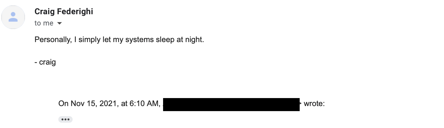 Hmmmm, does that mean he puts it in Sleep mode, or shut it down? Cryptic. Maybe a reply to his email is in order....Check this out. @LFC2020 was right all along. He shuts down his Mac just like @LFC2020!!! Check out his response belowWoo Hoo!!!