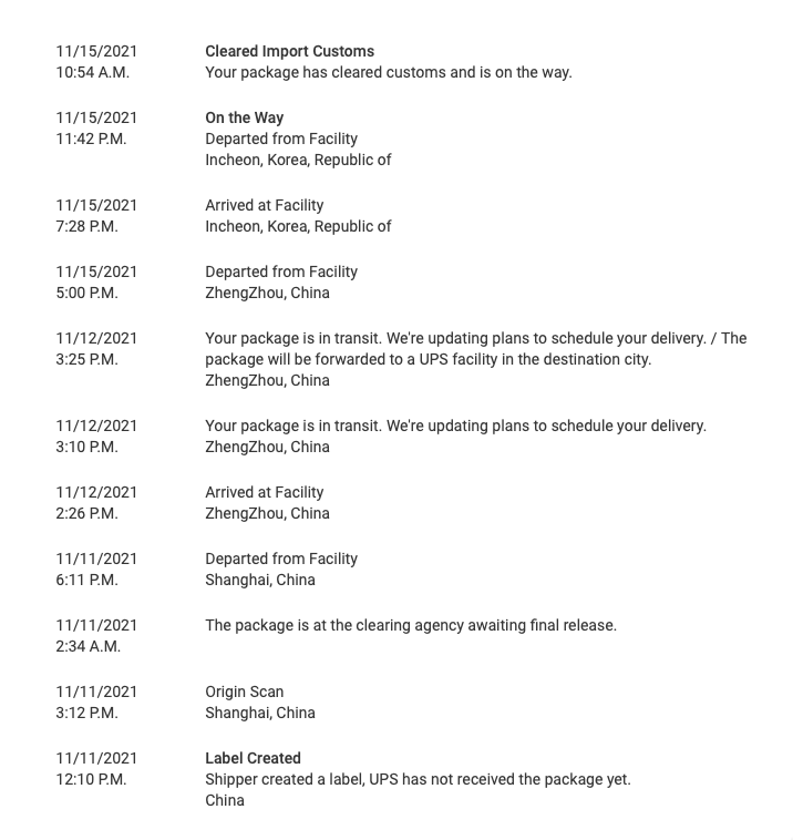 Hang in there, I had the same thing if you read back. UPS delivery estimates all over the place. Hope it clears fast! Should be to Anchorage soon. This might have been your flight. https://flightaware.com/live/flight/UPS99/history/20211115/1345Z/RKSI/PANCTracking update as of today... delivery estimate is today in the next 2 hours... I think it's safe to say that it's not arriving today as it allegedly clears customs in Korea this morning.