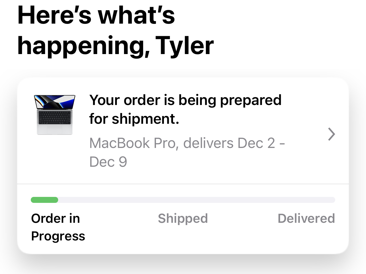 Misery all around. Hope there is another Mac in the meantime 4UWell my 16" M1 Max 32GB 1TB ordered on the 18th for a Nov 9- 16th delivery changed today to Nov 24 - 29 with no heads up. I contacted support yesterday and they said to reach out tomorrow if not delivered but I wonder if they can do anything now with the delivery date updated.