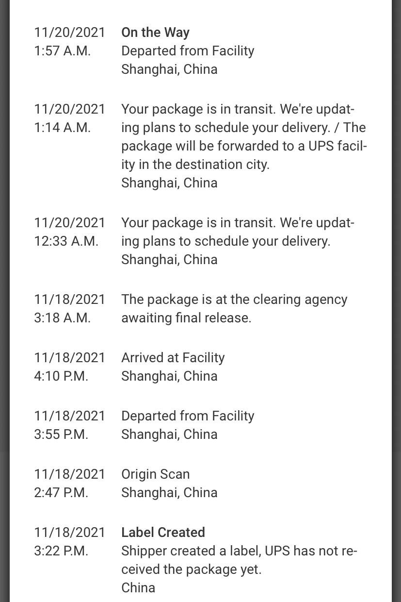 Mine still says its been picked up still no scheduled Delivery date yet for me and looks like it it is still in China- Like I said before - I think Fedex has it but just waiting for clearance from customs or just waiting intil the get more to fill a pallet. Apple order status page says Nov. 26 - I say it dose not leave china soon then it won't get here by Friday November 26,- I also ordered a Keyboard cover from here https://gouppercase.com/products/premium-keyboard-protector - since they have them now for the 14 & 16 inch M1 Pro/ M1 Max MacBook pros now- this kind of the cover that I have been using on my 13 inch intel july 2019 MacBook Pro and it has really helped keeping all of the crud out between the keyboard keys since the July 2019 had the butterfly keyboard and I really had not had a issue with since I have been using the cover