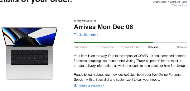 With my order Apple estimated I would of got my laptop on November 26, but it came on Wednesday Nov. 24My UPS tracking finally started working. I got the shipping notification on Nov 19 but tracking number never worked until today. Tracking shows an export scan from Shanghai,China this morning. Delivery date is 1 day sooner than Apple’s quoted date.