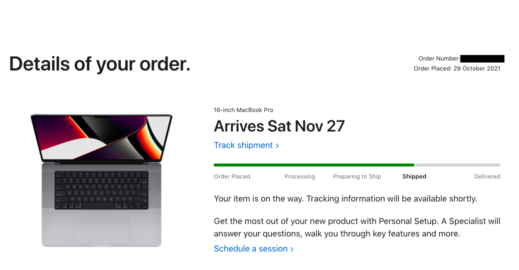 Welcome to Apple/UPS purgatory!!! There are quite a few us in the same situation. My 16" Max with 24 core GPU, 32GB Ram, and 1 TB SSD that was ordered on 10/25 has been stuck on the same UPS message since Friday 11/19. No one at Apple or at UPS can tell me anything about the shipment (they just blame each other). According to Apple, I am supposed to have my Mac delivered to me in Oregon by 12/1. There is a sub-Reddit with a bunch of the same from others who are having their machines shipped with UPS. Seems like Apple created the labels, with tracking, and those machines have been sitting in some warehouse waiting for UPS to pick them up. Not sure why Apple would send shipping details to customers and then let them sit? I would have been more understanding if my order was "preparing to ship" and not "shipped" but not really shipped.
