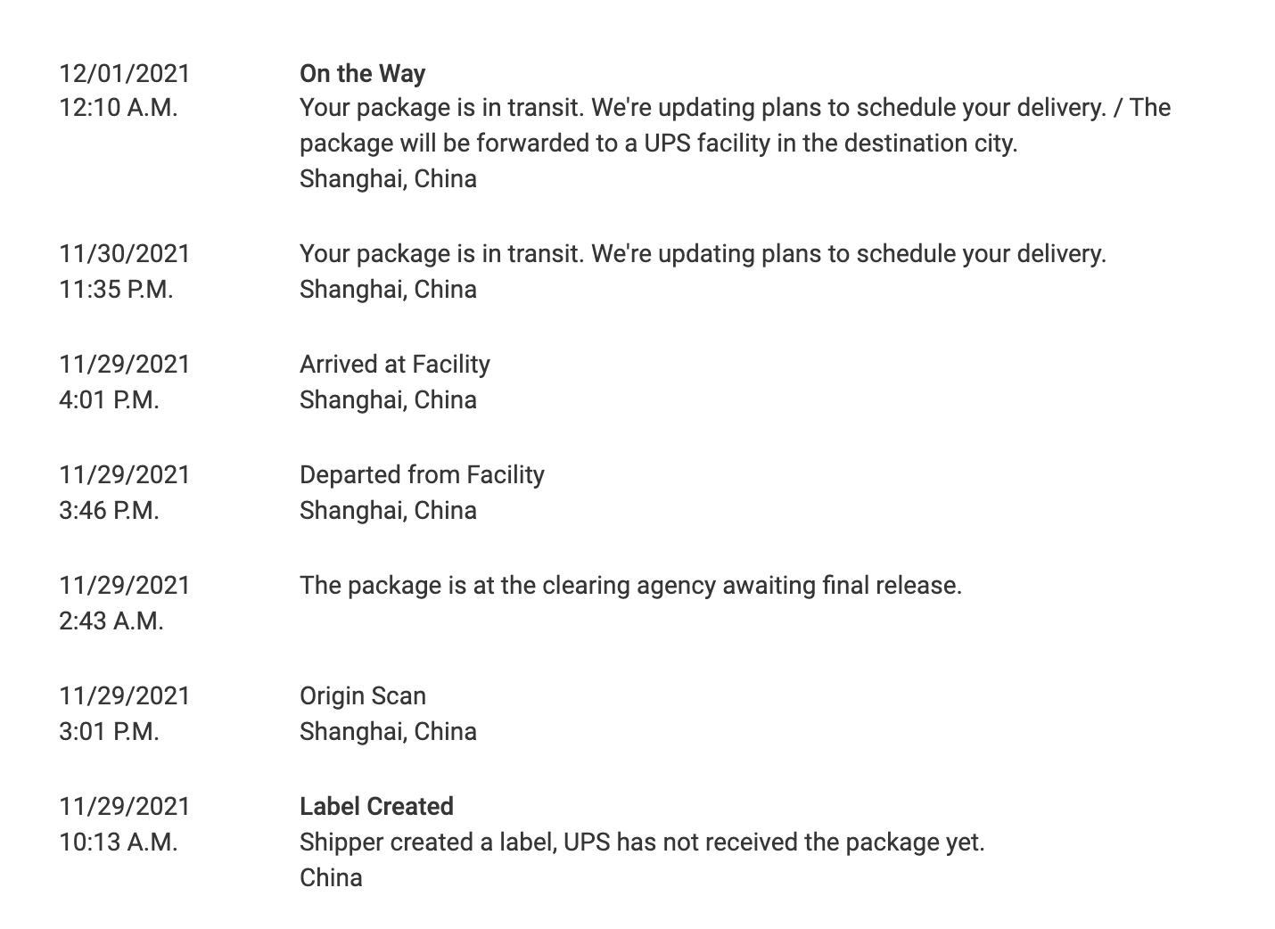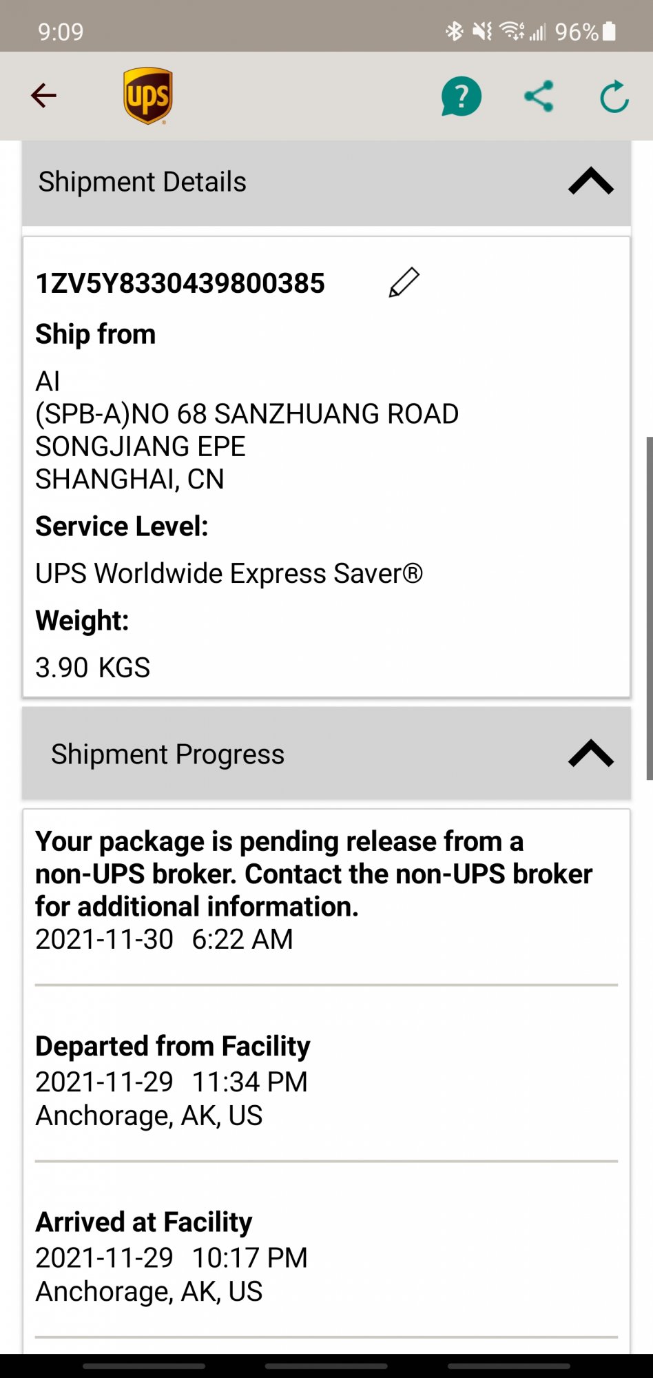 I got the non ups broker in Shanghai. I got it again in Louisville before being forwarded to Canada. Mine left Shanghai about 27hr after the first non ups broker update and left Louisville about 15yr after the 2nd non ups broker update. Mine is in Canada now and left mount hope last night. Delivery date is on Dec 2.