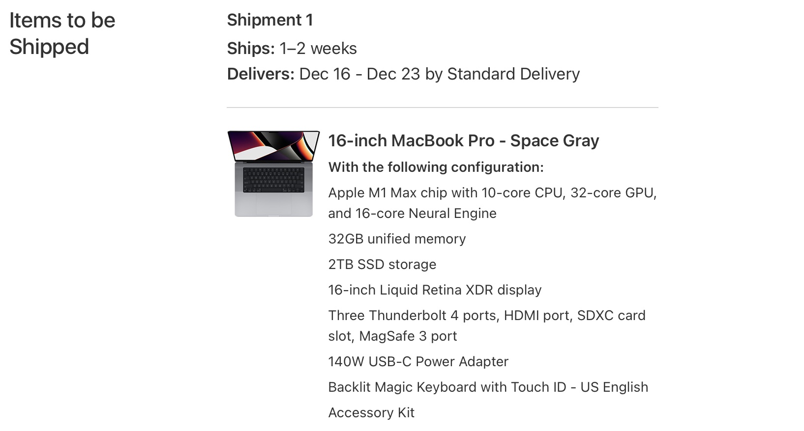 When I ordered on 10/23 I got the estimated delivery on December 9- 16. Several places in the info I now see on UPS.app about my MBP still says I'll get it on 12/9! But elsewhere, while seeing it is now 12/9, it tells me to check back tomorrow for "updated delivery date".My M1 max 16" 32c/64GB/1TB silver is scheduled to arrived tomorrow(Dec 09, 2021) end of day.