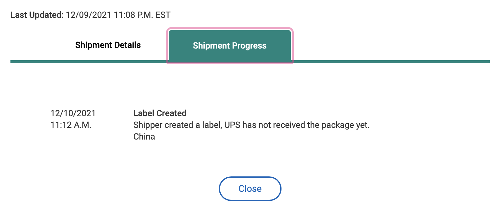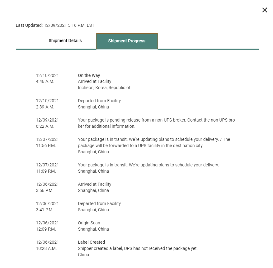 EDIT: Ops I didn't see the Shipment progress tab on UPS. It says 12/10/2021 11:12 am label created exactly the same as yours, and now it says On the Way arrived in Shanghai, China. I bet our computers are on the same flight now!