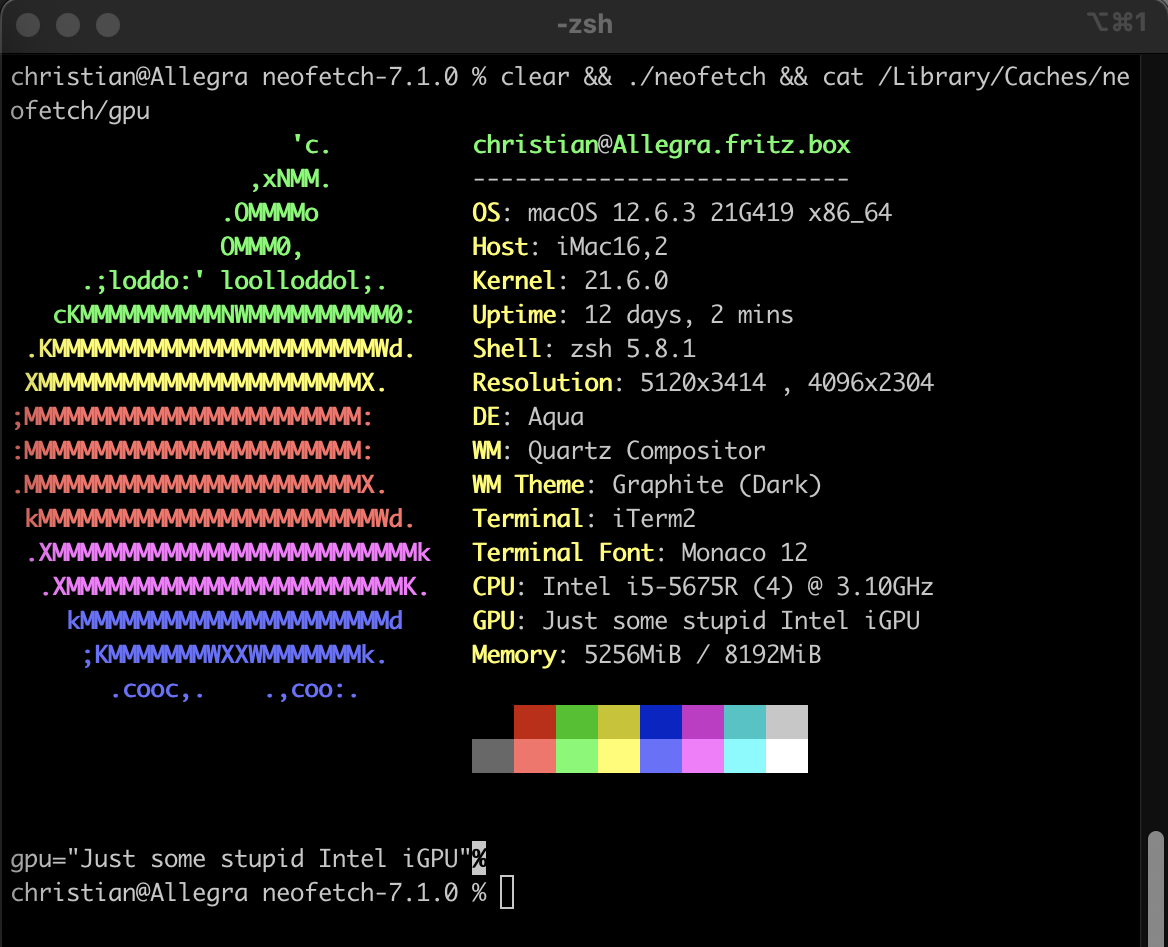 [And for reference, this is neofetch on the aforementioned donor OS X Snow Leopard build from the MBP8,1]: