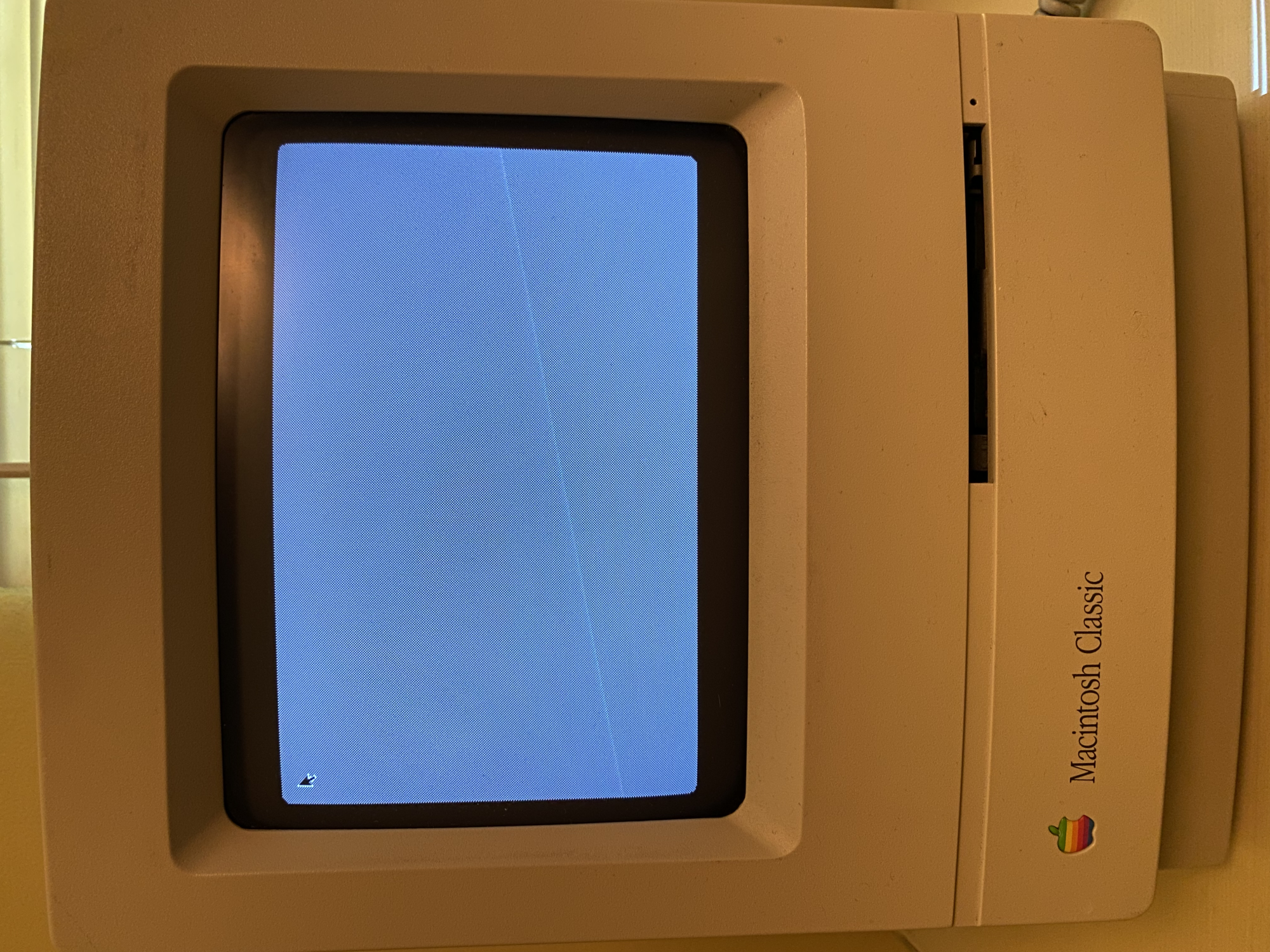 Hello everybody, I'm new to the hobby of vintage computer collecting and I am having problems with this particular Macintosh classic. I've just been totally overwhelmed by all the information I've researched about these Macs and I would like some guidance for some troubleshooting. I recently found my dad's old Mac classic and when I went to turn it on nothing happens besides a whirring noise which I assume to be the SCSI drive, a blank screen pops up and a cursor appears on the top left corner. I tried the command "cmd + ctrl + X + O" but nothing happens. I am quite lost at exactly what could be the issue or is there just something i'm doing wrong. I don't think there's anything wrong with the CRT but could it be something wrong with the analogue board? the motherboard? If anyone can point me in the right direction and help me figure out what on god's green earth is going on with this computer it would be greatly appreciated. (I attached an image of what I see when I turn on the Mac)