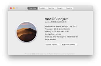 - New "About This Mac" window now displays Mojave and the icon changes based on which theme you have: