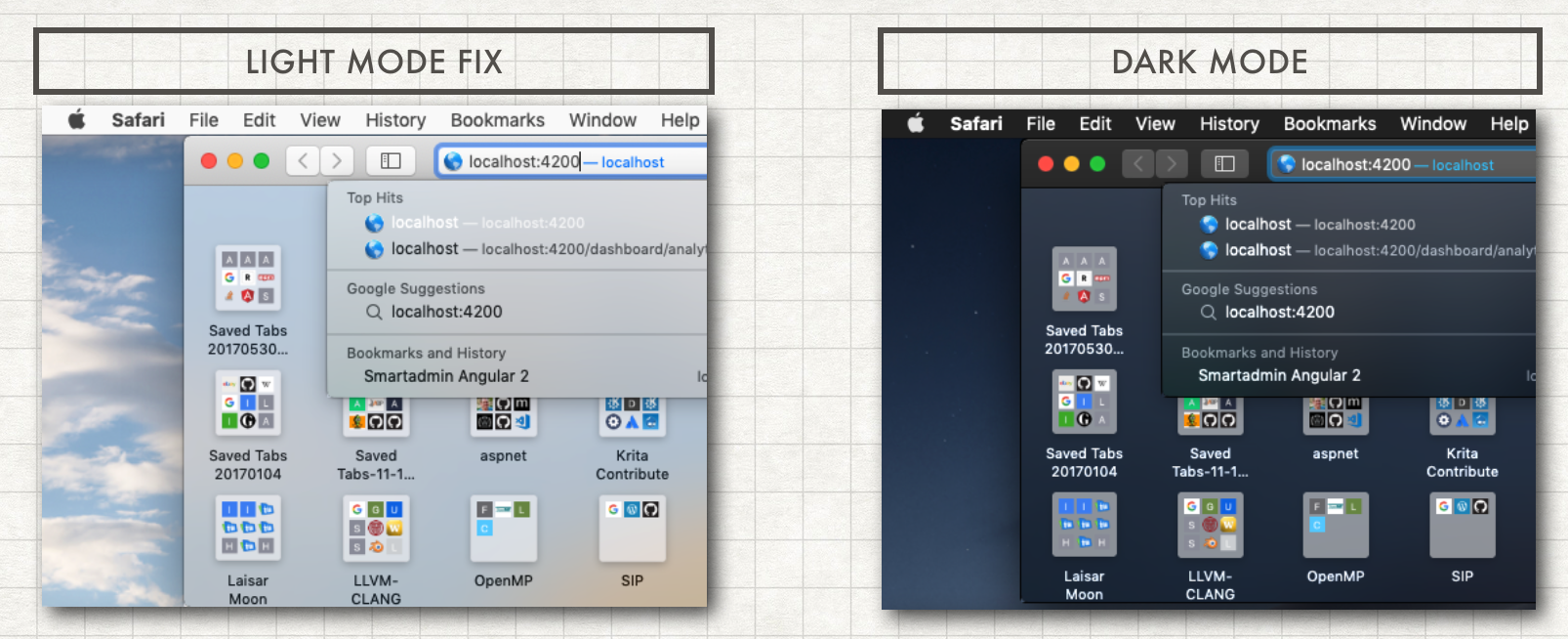 The patches prove that vibrancy in Light mode is achievable. The only possible explanation is that a special core animation layer combination + blend and filter compositing sauce just doesn't sit well with our old GPUs in Light. Since there are no real tools to peel through these ca layers in an asset bundle (except for a secret internal Apple one called Mica) I am developing one based on Zielinski's ThemeEngine. I've already forked the project on github. This has the most promise for an alternative to patching frameworks.