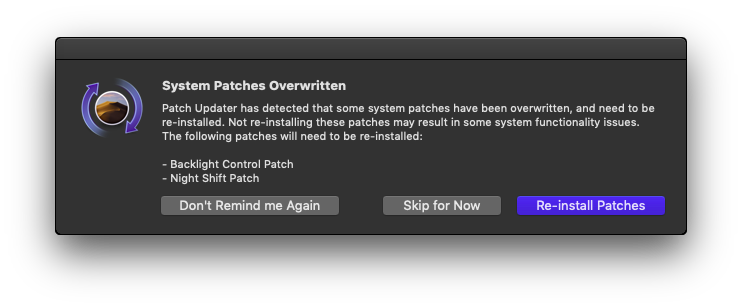 Thank you works like a charm is there a possibility implementing it in the Mojave patcher. I have a feeling after the post install patches they get overwritten during the reboot processJust finished implementing a new Patch Updater feature! Now, Patch Updater has the ability to check the integrity of patches installed on your machine, allowing it to detect cases where system patches get overwritten (such as during a software update, etc.) When such a case occurs, it will alert you and prompt you to re-install the affected patches automatically. The new Patch Updater version is, of course, available as an update through previous Patch Updater versions. Also, both this new patch integrity check feature, and automatic update checking, can be disabled via the new System Preferences item.