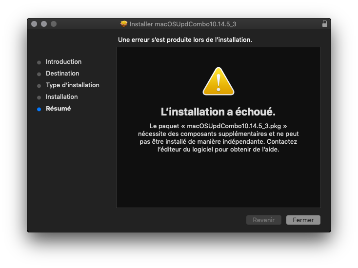 So I found a link to download "macOSUp10.14.5_3.pkg" and "macOSUpdCombo10.14.5_3.pkg" but it's impossible for me to install any of these updates I have the following error message: