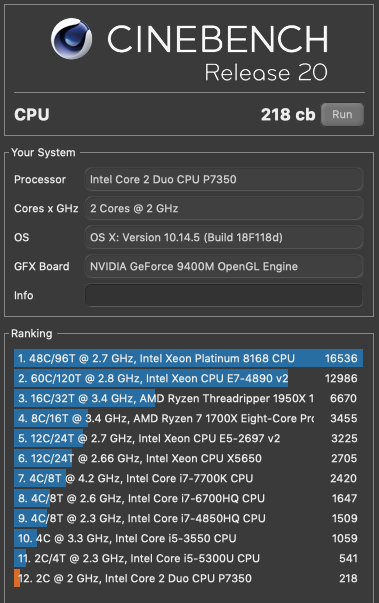 Curious - they dropped the OpenGL test in R20. Do you have R15 handy to get the OpenGL frame count? I tested .4 with R15 a little while ago on my mbp 5,3 and got single digit performance.A bit of a test for the MacBook5,1. Apparently Cinebench 20 is 8x more demanding than Cinebench 15.