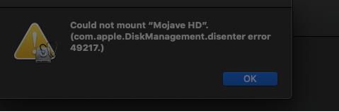 I have Mojave on Crucial SDD 500gb partitioned with second half being High Sierra connected internally to my Optic dive bay cable. Only Mojave volume is not mounting and earlier this drive kept unmounting by itself. When I press option key to boot the PC the volume shows up.