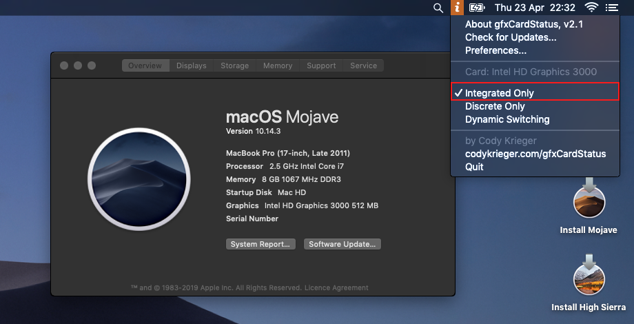 Strange colours, weird noises. Honestly thought it was going to blow up…so I quickly put the 'gfxCardStatus' app on from a USB stick, and switched to Integrated Only.