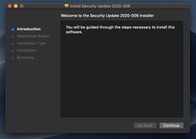 If you saw my post above you would know that there is a distribution file. You only installed 1/3 of the update. The only way to do it propery is through SU as Apple does not provide a full standalone installer. Maybe @jackluke knows how to assemble the complete installer from separate .pkg files?Updated successfully using alphascorp's link to the the package installer http://swcdn.apple.com/content/down...fqtwb8spzgv1apgu8wym/SecUpd2020-006Mojave.pkg