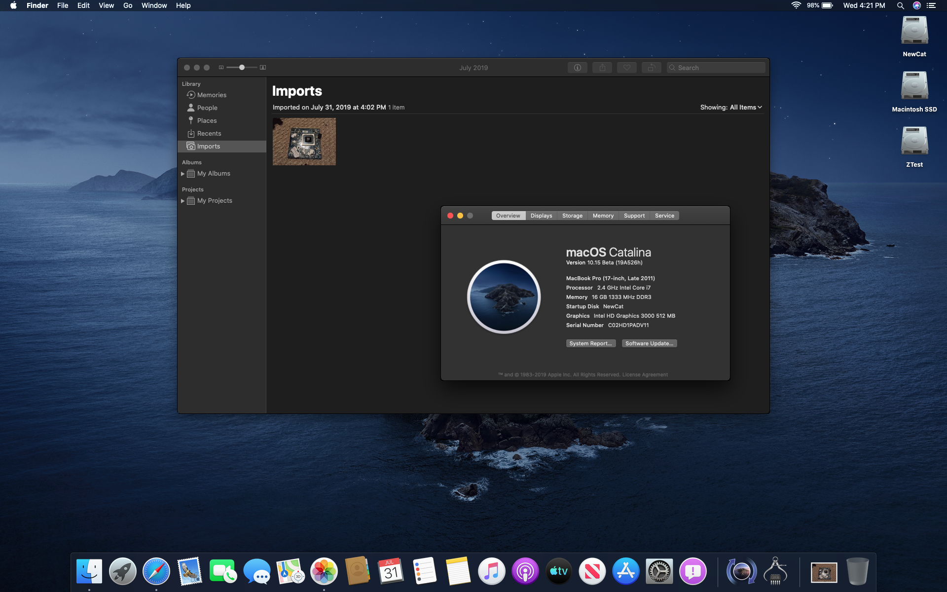 Just released a new version of Catalina Patcher (v1.0.3), which now includes support for Catalina Developer Preview 5. Also, PHOTOS now WORKS under Catalina with non-Metal GPUs!!