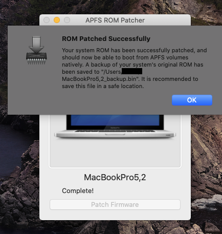 The APFS patcher took 10 very tense minutes to upgrade the firmware, but it did the job!!!