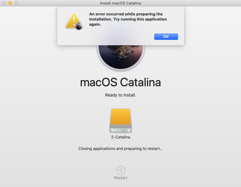 Thanks for confirming. I'm restoring backups for my mac. Wonder if I can try look for an older catalina image and run the installer again to see if that works.Yes. "Error occurred while preparing the installation. Try running this application again." is exactly the error I see. I am tempted to retry it with a copy of the 15.0.33 full installer downloaded from a supported machine but doubt I'll get a different result.
