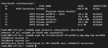 I did a fresh install and it's about 30GB. I did a successful Archive to a file but on my Supported Mojave machine it wasn't mountable. But it could still be, anyways did not want to risk it, so I decided to partition the drive and shrink the fresh install volume to the exact size of the data, that way I don't have to run the count= and just let it copy the entire partition and can even leave sparse off. I was out shopping today, so I'm back now to see if dd is good enough. It seems going to a file and restoring it is the best option you can even pipe to a file and go to a disk but keep in mind the disk will have the exact same info as the original so I believe dd to a file is the best option, plus you can keep it on other backup volumes and restore. I don't know what formats dd actually supports. I hosed my Catalina install with dd from disk to disk. So I'm not dd'ing from my 2008 Mac yet, just my supported Mac.