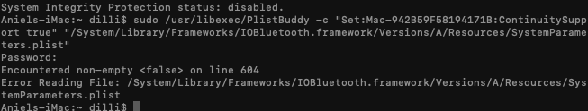 iMac:~ dilli$ sudo /usr/libexec/PlistBuddy -c "Set:Mac-942B59F58194171B:ContinuitySupport true" "/System/Library/Frameworks/IOBluetooth.framework/Versions/A/Resources/SystemParameters.plist"