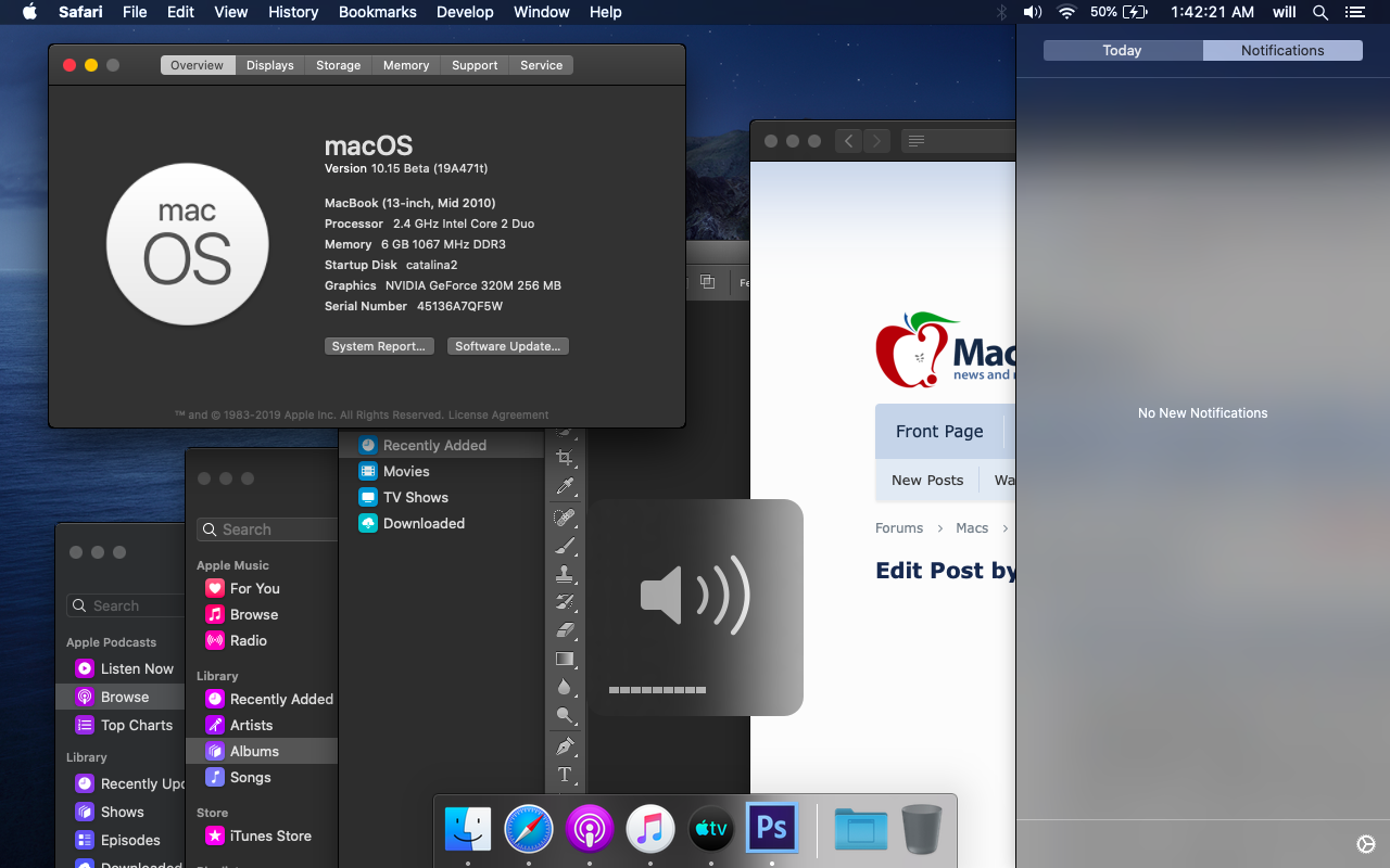 - I'm having trouble reimplementing the function SLSSetDockRectWithOrientation() which means that the Dock won't "collide" with windows properly just yet. This is a fairly minor glitch, though.