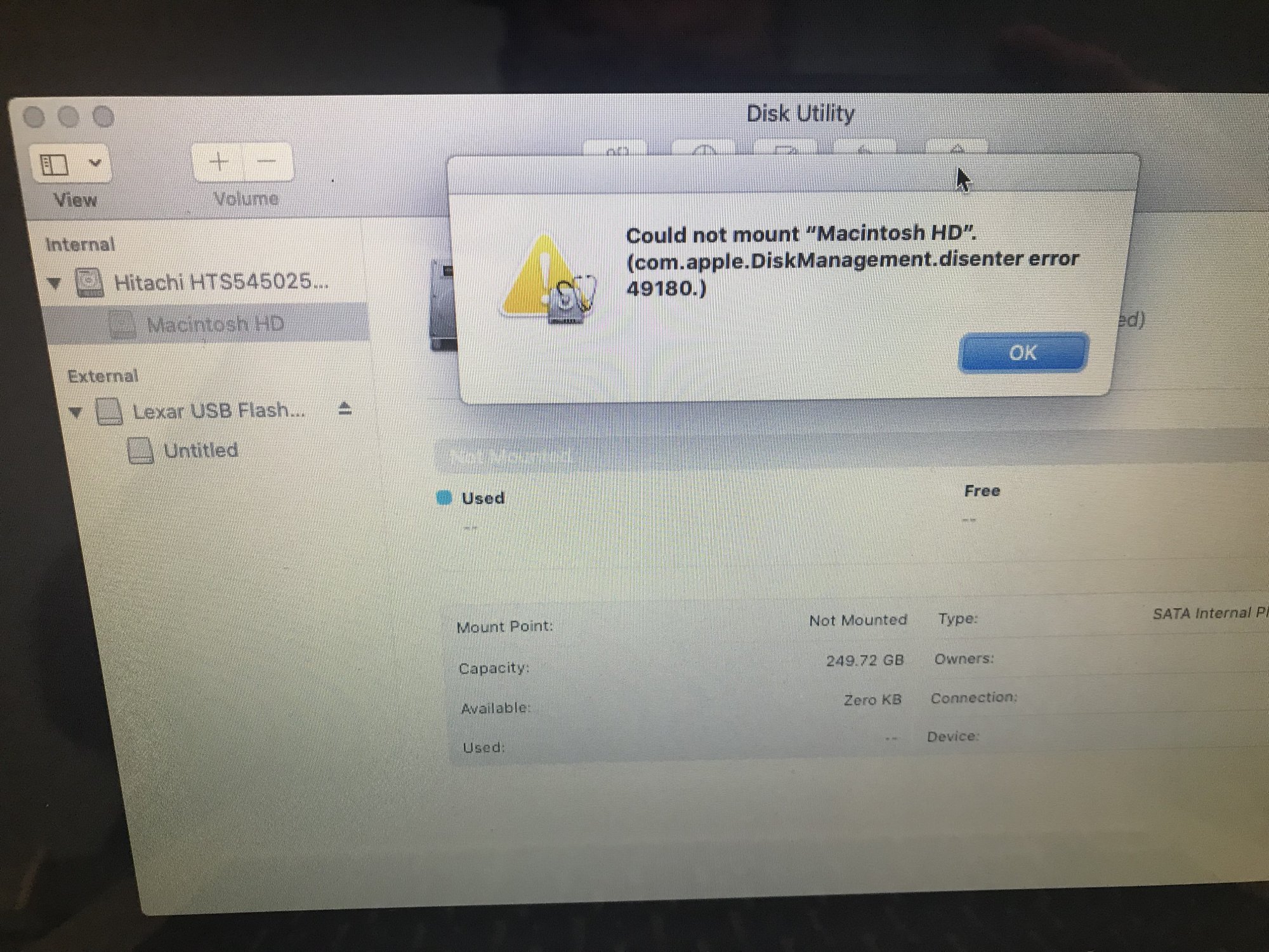 Tracked down an interesting problem this weekend. I've read on here some people are having issues making a working Catalina Patcher USB drive. I hadn't run into it often myself, and when I did I would simply install to this machine from within Mojave, but I had an HFS+ Mojave install which won't allow you to upgrade to Catalina until you convert to APFS first. So I booted the patcher and went to Disk Utility to unmount the drive and convert to APFS. The drive was already unmounted (greyed out) and any attempt to mount it was met with the error message below :