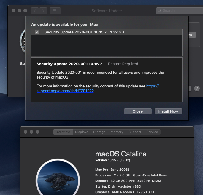 Further - Case-in-point, here is Apple's current release catalog. Note H15 is the final published dot7 entry. To get H114, the current release, the only methods are to D/L the SU .dmg from Apple, here - https://updates.cdn-apple.com/2020/...-b4af-93751f8a1f66/SecUpd2020-001Catalina.dmg and employ the only slightly risky #13,107 to complete the update or use the Software Update Control Pane after the steps in CatalinaOTAswufix.app are applied. And now, the .dmgs are going away in favor of Software Update Control Pane, exclusively. H505 is already there.