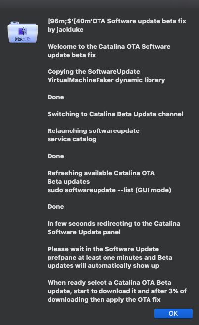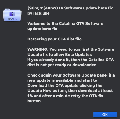 At this moment, you may download and install that OTA update. While downloading, launch the CatalinaOTAswufix again (you may prelaunch it actually) and click on the middle button of OTA update fix. This will patch the downloading OTA update, and a successful long message should appear.