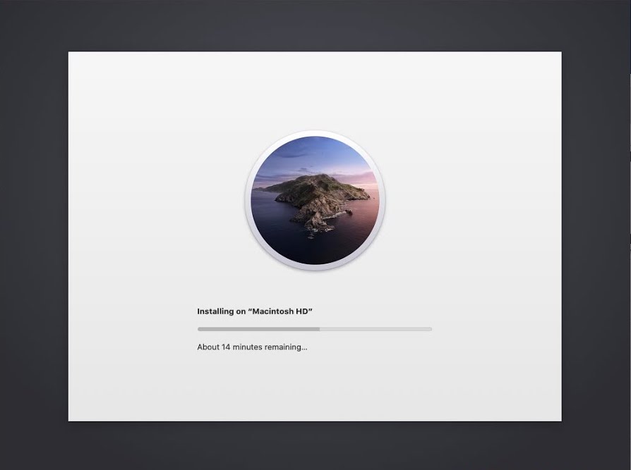 2) apple logo long loading bar followed by Catalina logo installing (OTA pre-scripts verifying on your APFS volume) (it may take up to 15 minutes, but on average about 10 minutes)