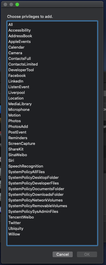 Found my solution (post# 9732). Thank you to @GrimMethos. I was wondering which of these privileges needs to be selected to allow Teams to also generate notifications (such as the response to a message). Would it be 'PostEvent'?Hello everyone. Discovered another issue on my fresh install of 10.15.7 running H114 security update. Seems applications like Teams or Skype isn't able to access my camera. Looking in Security and Privacy, I don't see any app requests to use those devices. Facetime on the other hand works fine with the camera. I've reinstalled Teams and rebooted but it just doesn't want to ask for permission. Am I missing some setting in Catalina? I'm wondering if having SIP off is somehow breaking certain apps being able to request access to things like cameras, etc?